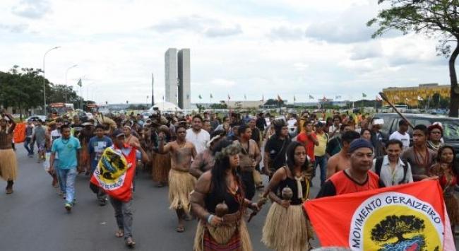 Os índios protestam contra a Proposta de Emenda à Constituição (PEC) 215, que transfere do Poder Executivo para o Congresso Nacional o poder de demarcar terras indígenas, contra recentes decisões do STF e pedem agilidade na oficialização dos territórios indígenas.