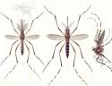 Este mosquito possui apenas 0,5 cm de comprimento, e sua cor é preta com pequenas manchas brancas nas patas, cabeça e torso. Ele emite pouco barulho e costuma picar as pessoas nas regiões abaixo do joelho, pois voa baixo. Outra característica é que a fêmea pica no período final do dia.