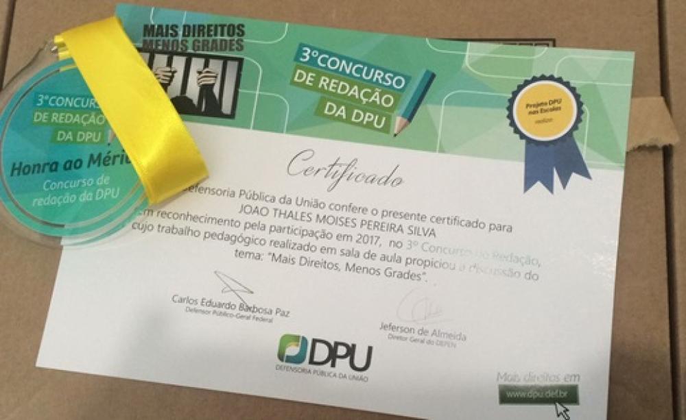 O reeducando João Thales Moisés Pereira Silva, da unidade prisional de Ceres, foi o grande vencedor do Concurso Nacional de Redação 2017, promovido pela Defensoria Pública da União, com o tema “Mais Direitos, Menos Grades”. Ele é aluno escola Joaquim Vieira do Vale, que funciona dentro da própria unidade prisional.