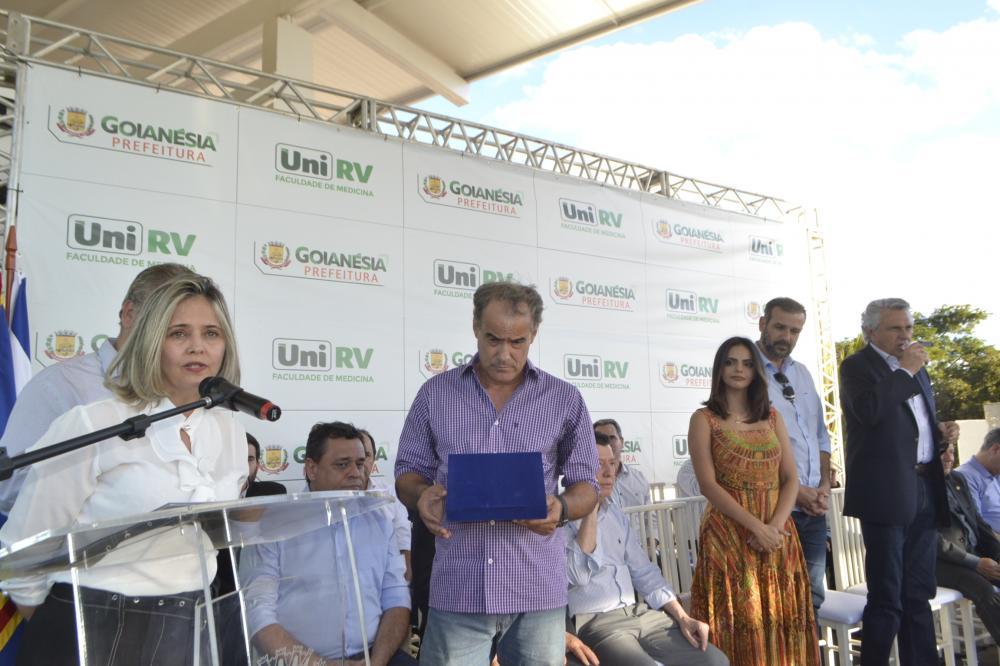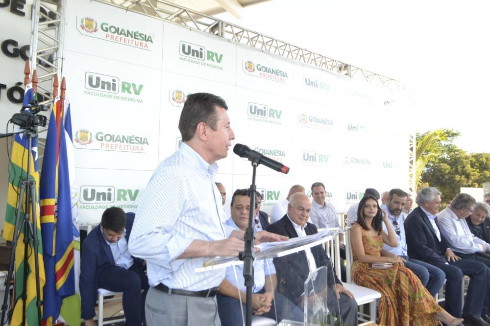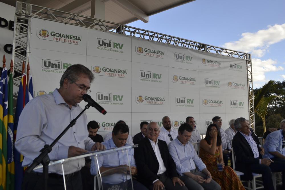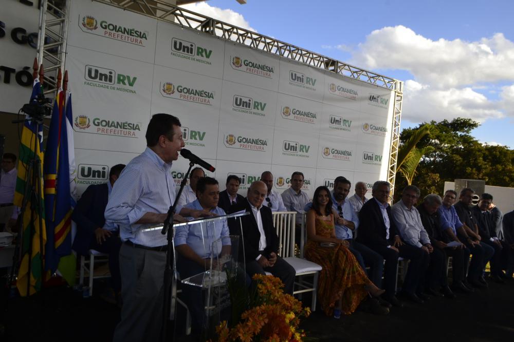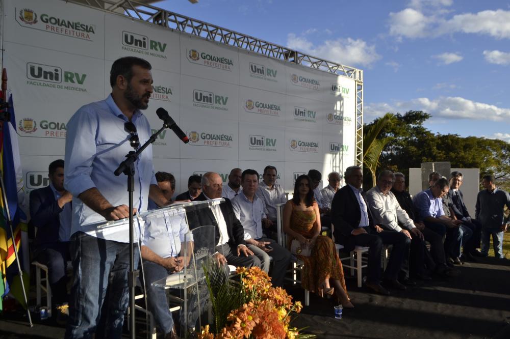 O Governador do Estado de Goiás Ronaldo Caiado, abordou a importância daquela obra e seus resultados para o bem do estado e por intermédio da Secretaria de Estado da Saúde fez a doação de trinta equipamentos hospitalares a Prefeitura Municipal de Goianésia para uso na rede municipal de saúde, atendendo o Hospital Municipal UPA e PSFs. Descerrou a placa inaugural das novas instalações da Faculdade de Medicina da Universidade de Rio Verde.