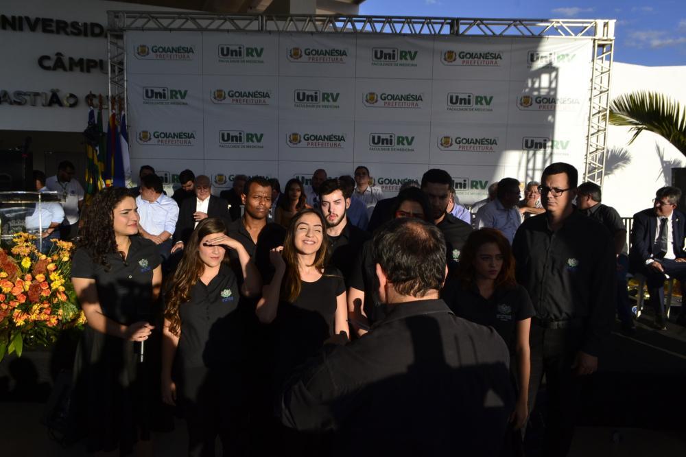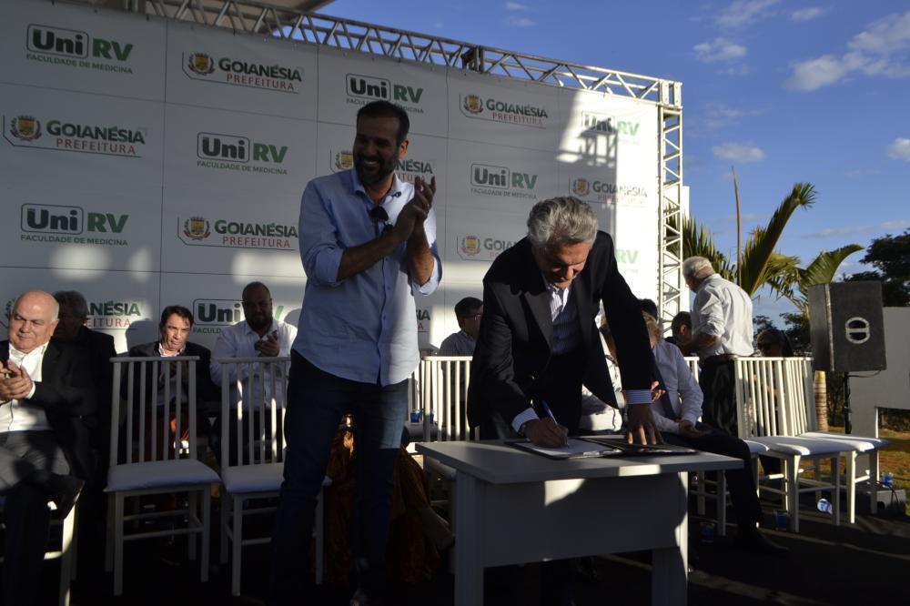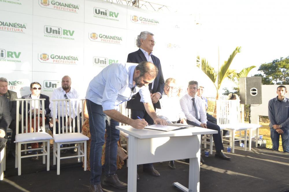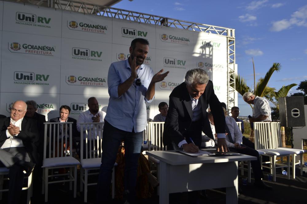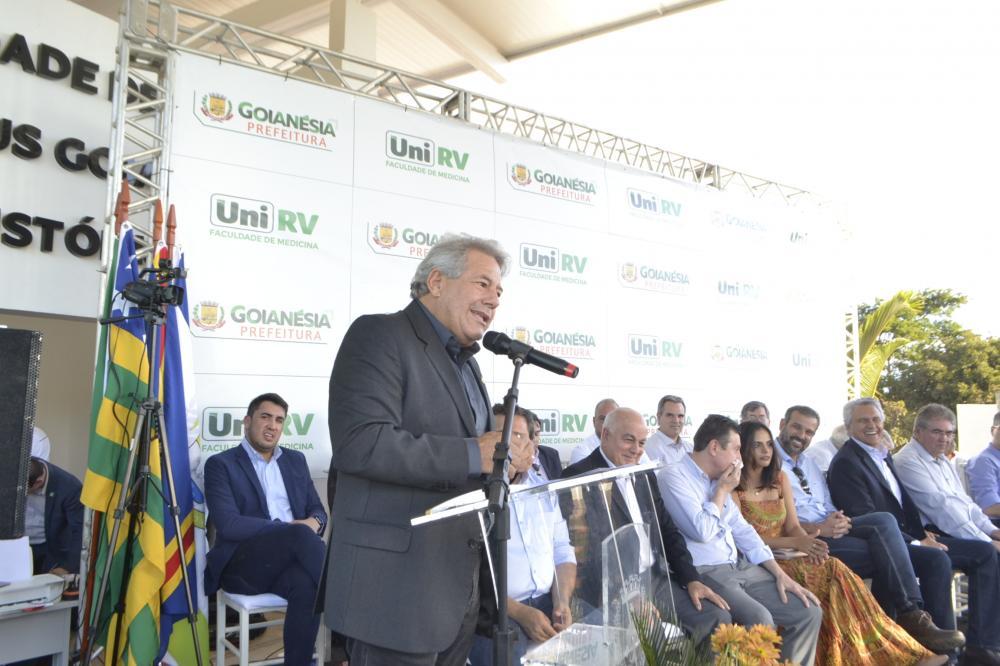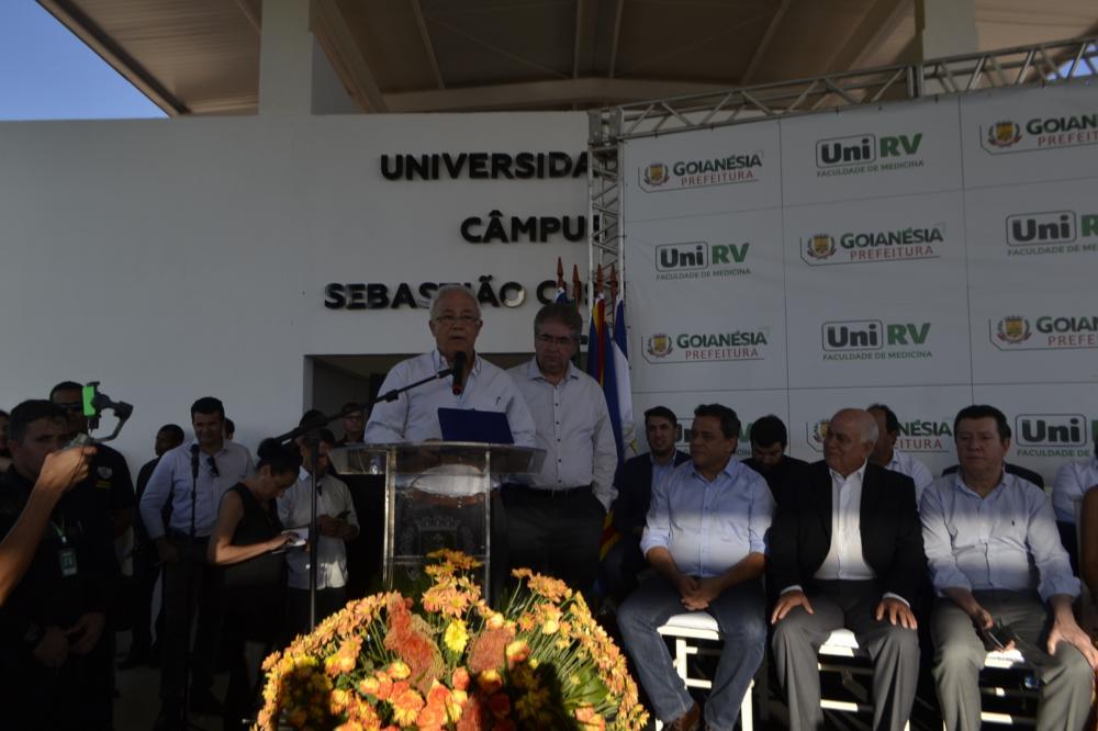 O Governador do Estado de Goiás Ronaldo Caiado, abordou a importância daquela obra e seus resultados para o bem do estado e por intermédio da Secretaria de Estado da Saúde fez a doação de trinta equipamentos hospitalares a Prefeitura Municipal de Goianésia para uso na rede municipal de saúde, atendendo o Hospital Municipal UPA e PSFs. Descerrou a placa inaugural das novas instalações da Faculdade de Medicina da Universidade de Rio Verde.
