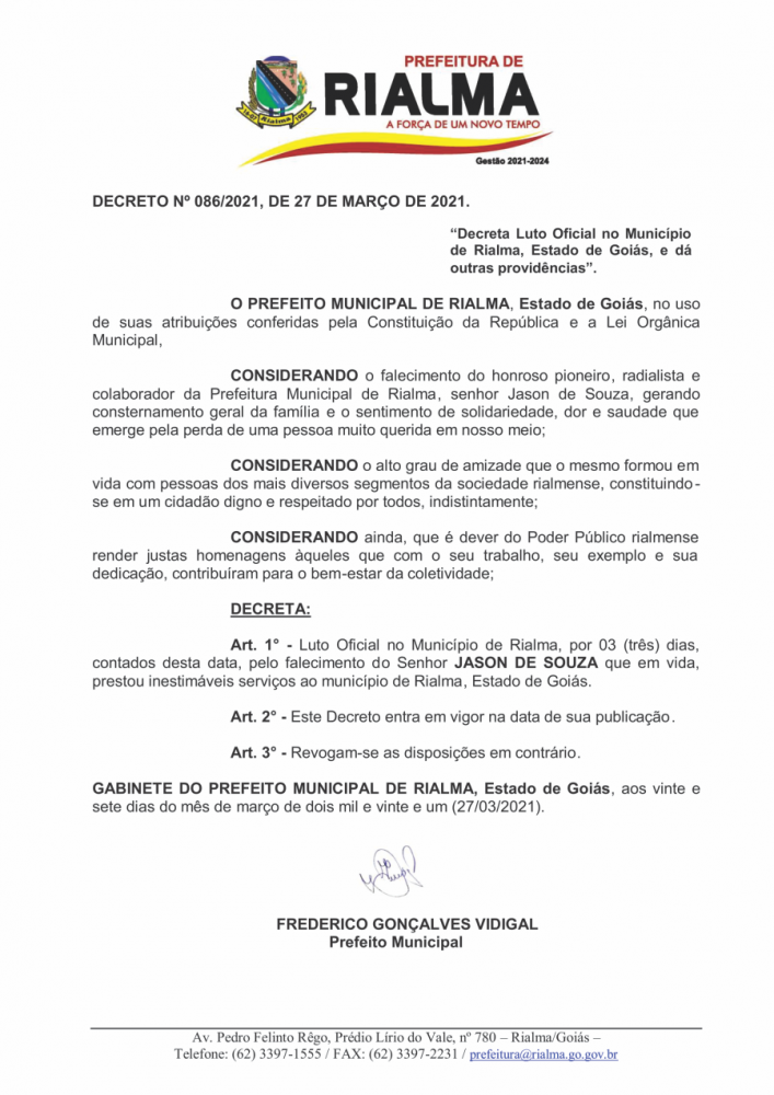 Tweet Prefeitura de Rialma Decreta luto oficial de 3 dias pela morte do Radialista Jason de Souza Comunicado NOTÍCIAS RELACIONADAS Palestra especial com Dra. Luciana Darrot, trazendo conhecimento e motivação para mulheres que desejam empreender, crescer e transformar suas realidades. Prefeitura de Rialma informa: Evento Mulher EmpreendedoraUm momento especial de inspiração,... Convite para a 1ª Feira do Agronegócio do Vale do São Patrício Convite para a 1ª Feira do Agronegócio do Vale do São Patrício O secretário de... Câmara Municipal de Ceres realiza a 1ª Sessão Ordinária do mês de março de 2026 Câmara Municipal de Ceres realiza a 1ª Sessão Ordinária do mês de março de... Ceres promove capacitação sobre cuidados com o pé diabético e recebe R$ 10 mil para fortalecer Atenção Básica Ceres promove capacitação sobre cuidados com o pé diabético e recebe R$ 10 mil para... Mais lidas ComunicadoComunicadoCidadaniaJustiçaMeio Ambiente Comunicado Rianápolis celebra o encerramento da 9ª Copa... Comunicado Ceres - Goiás informa: 24 Edital de Convocação Comunicado 6º EDITAL DE CONVOCAÇÃO – PROCESSO SELETIVO... ConCHESP realiza a primeira reunião de 2026 e... Visita institucional fortalece a saúde de Ceres Aluguel Social com Vagas em Ceres