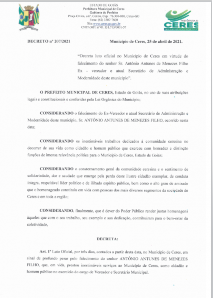 ComunicadoEm razão do falecimento do ex-vereador, presidente da Câmara Municipal de Ceres, atual Secretário Municipal de Administração e Modernidade, o Sr. Antônio Antunes de Menezes Filho, ocorrido na madrugada deste domingo, 25 de abril de 2021, em Goiânia, a Prefeitura de Ceres decretou luto oficial por três dias no município. De acordo com o texto oficial, durante o período de vigência do luto oficial as bandeiras deverão ficar hasteadas a meio mastro em todos os órgãos públicos municipais.