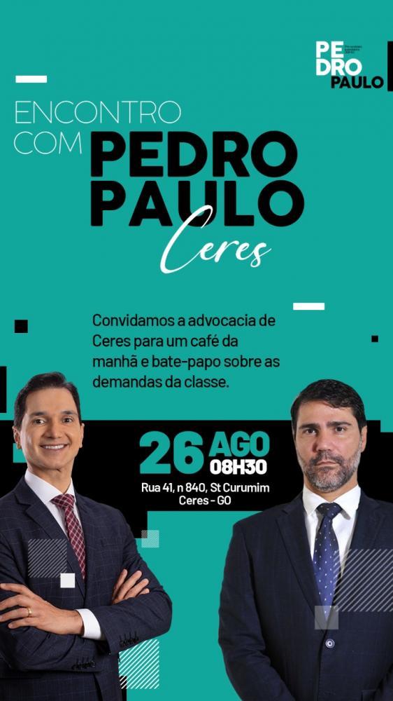 Nesta quinta-feira, às 08:30, o pré-candidato à Presidência da OAB Goiás, Pedro Paulo de Medeiros, conversará com os advogados e irá ouvir os anseios da classe, em Ceres. Pedro será recebido pelo advogado Dr. Tyrone Guimarães e demais colegas de ordem.