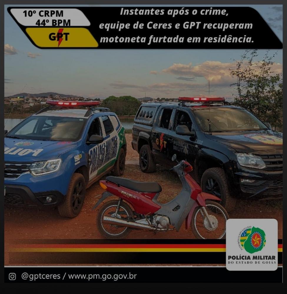 Nesta quarta-feira (01/09), a Equipe 1.12870 e Equipe GPT-Ceres 10494 tomaram conhecimento de um furto a residência ocorrido no Setor Vila Nova em Ceres, no caso uma motoneta Honda Biz de cor vermelha, placa KER 7943 e alguns pertences subtraídos. As equipes intensificaram o patrulhamento e, instantes após conseguiram localizar um indivíduo que estava com a motoneta. Na residência do autor ainda foi localizado um capacete que também havia sido levado. Diante da situação, os pertences e o autor foram apresentados a Delegacia Cívil de Ceres para os procedimentos cabíveis.