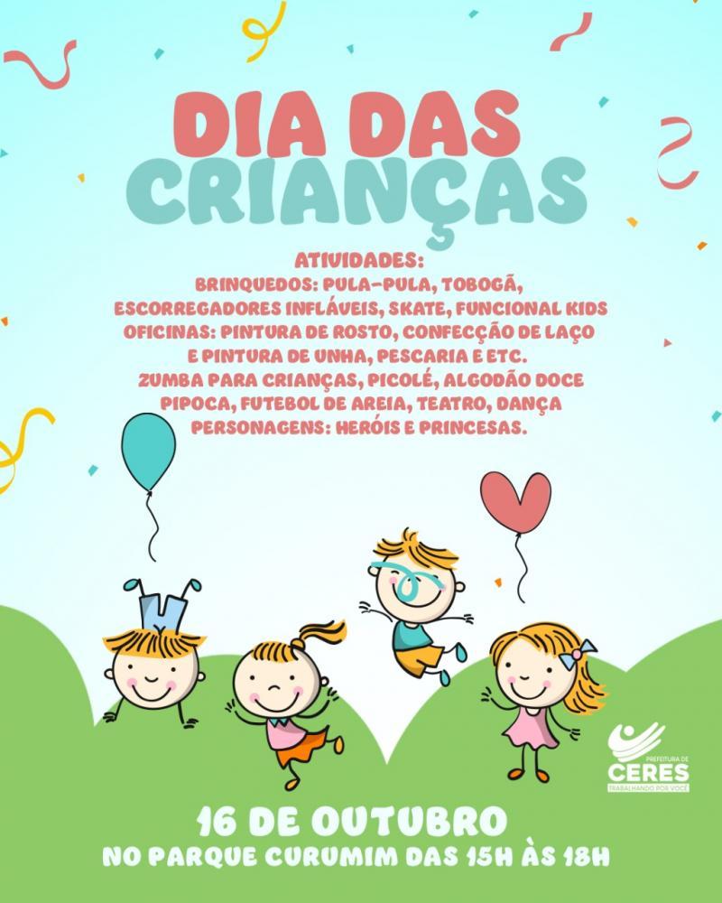 ComunicadoNo próximo sábado, 16 de outubro, será realizada em Ceres uma festividade em comemoração ao Dia das Crianças. O evento será realizado no Parque Curumim, das 15h às 18h, e contará com diversas atividades para oferecer muita diversão às crianças da comunidade. A festividade está sendo organizada pela Prefeitura de Ceres, por meio da Secretaria Municipal de Desenvolvimento Social, e será obrigatório o uso de máscara e de álcool em gel para higienização das mãos.