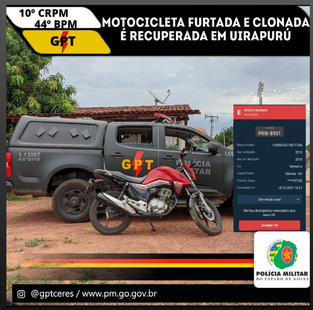Nesta segunda-feira (18/10) a Equipe do GPT 1.13087 em patrulhamento pela Av. das Araras, Conjunto Beija-flor, na cidade de Uirapuru - Goiás, visualizou uma motocicleta Honda CG Titan 160 vermelha, ostentando a placa