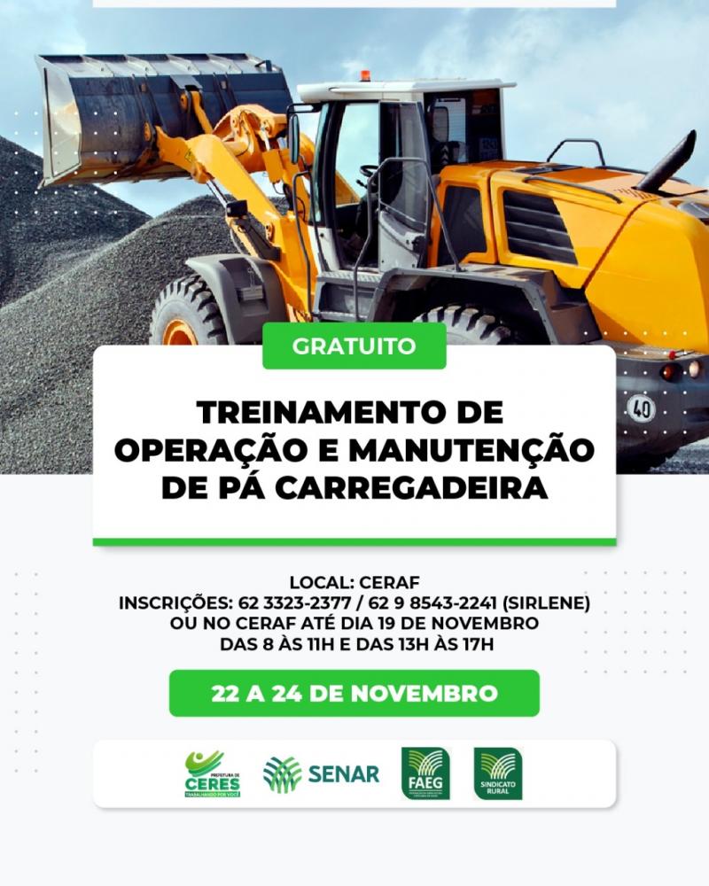 A Prefeitura de Ceres, por meio da Gerência de Desenvolvimento Rural, informa a toda comunidade que estão abertas até dia 19 de novembro as inscrições para o curso de Treinamento de Operação e Manutenção de Pá-Carregadeira desenvolvido em parceria com o Sindicato Rural e o SENAR, que será realizado entre os dias 18 e 20 deste mês, no CERAF.