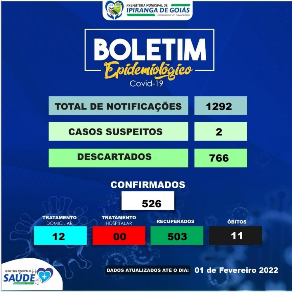 ComunicadoA Prefeitura Municipal de Ipiranga de Goiás, por meio da Secretaria de Saúde, prezando pela total transparência e compromisso com a população, divulga seu boletim epidemiológico COVID-19 dessa terça-feira, 01 de Fevereiro