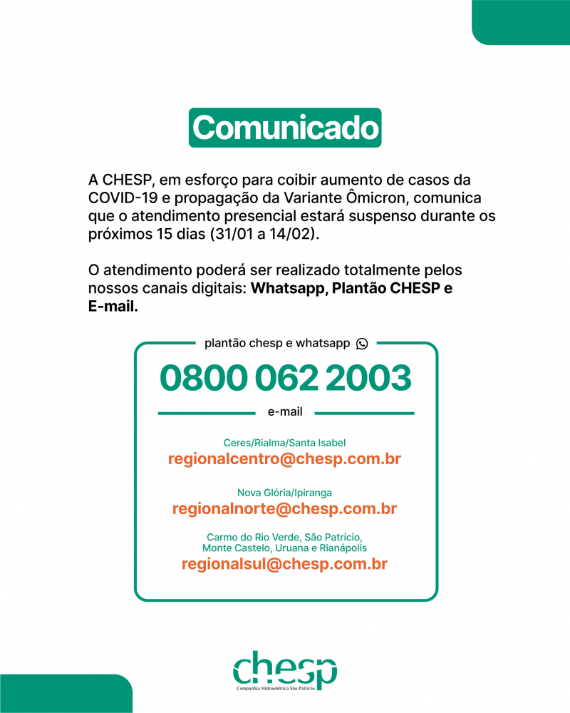ComunicadoA CHESP, em esforço para coibir aumento de casos da COVID-19 e propagação da Variante Ômicron, comunica que o atendimento presencial estará suspenso durante os próximos 15 dias (21/01 a 14/02).