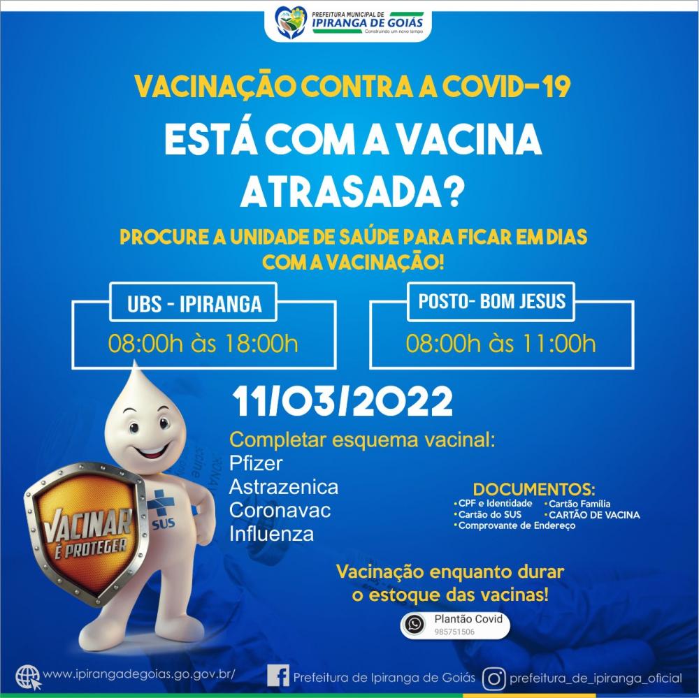 Tweet Ipiranga de Goiás - Vacina contra covid-19 Comunicado NOTÍCIAS RELACIONADAS Palestra especial com Dra. Luciana Darrot, trazendo conhecimento e motivação para mulheres que desejam empreender, crescer e transformar suas realidades. Prefeitura de Rialma informa: Evento Mulher EmpreendedoraUm momento especial de inspiração,... Convite para a 1ª Feira do Agronegócio do Vale do São Patrício Convite para a 1ª Feira do Agronegócio do Vale do São Patrício O secretário de... Câmara Municipal de Ceres realiza a 1ª Sessão Ordinária do mês de março de 2026 Câmara Municipal de Ceres realiza a 1ª Sessão Ordinária do mês de março de... Ceres promove capacitação sobre cuidados com o pé diabético e recebe R$ 10 mil para fortalecer Atenção Básica Ceres promove capacitação sobre cuidados com o pé diabético e recebe R$ 10 mil para... Mais lidas ComunicadoComunicadoCidadaniaJustiçaMeio Ambiente Comunicado Rianápolis celebra o encerramento da 9ª Copa... Comunicado 6º EDITAL DE CONVOCAÇÃO – PROCESSO SELETIVO... Comunicado Ceres - Goiás informa: 24 Edital de Convocação ConCHESP realiza a primeira reunião de 2026 e... Visita institucional fortalece a saúde de Ceres Aluguel Social com Vagas em Ceres