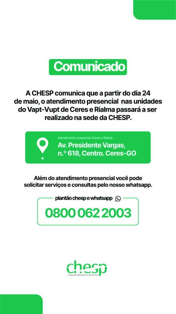 A CHESP comunica que a partir do dia 24 de maio, o atendimento presencial nas unidades do Vapt-Vupt de Ceres e Rialma passará a ser realizado na sede da CHESP.