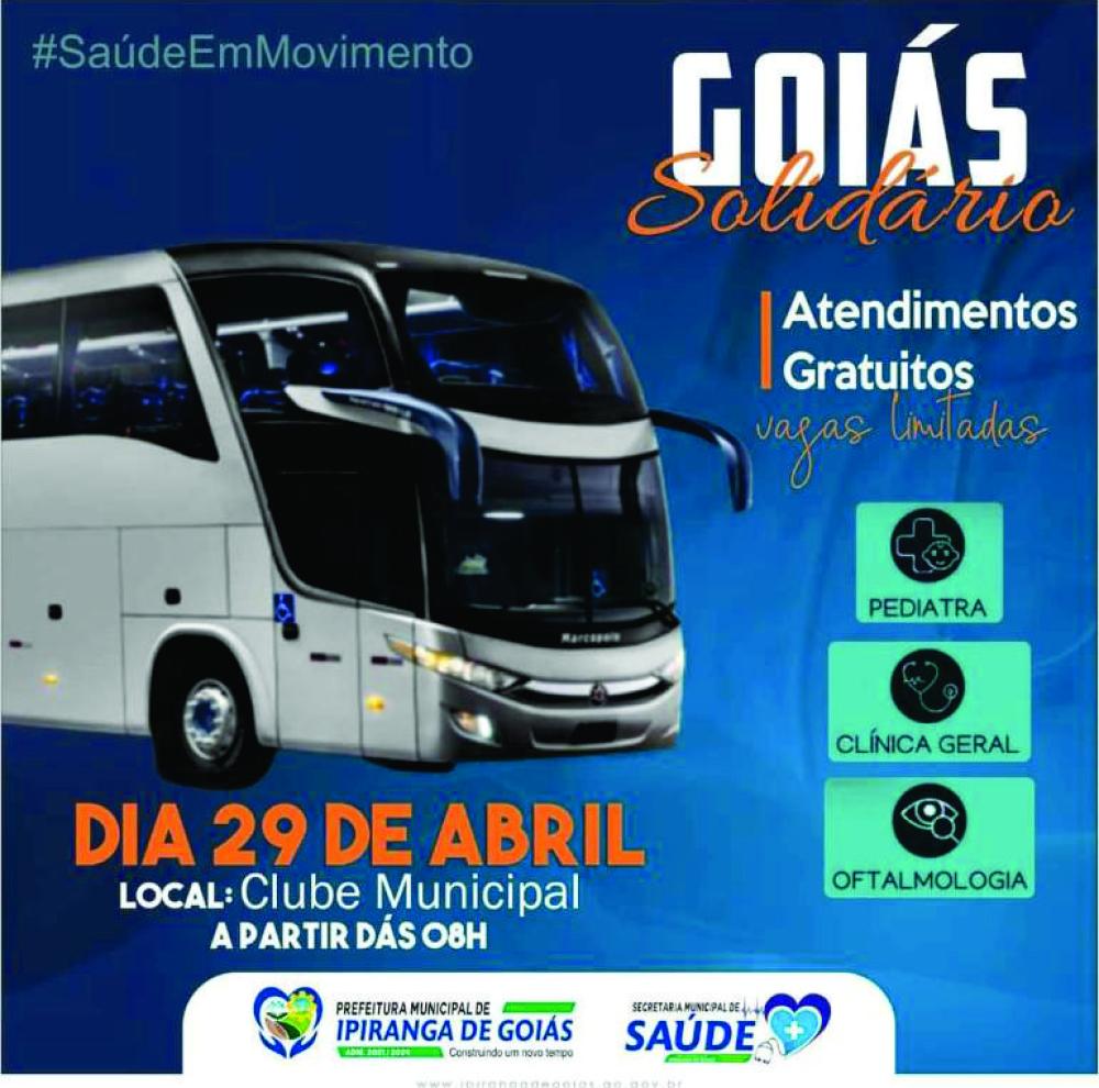A Prefeitura de Ipiranga de Goiás por meio da secretaria Municipal de saúde informa que, no dia 29 de Abril (sexta-feira), o ônibus do Projeto “Goiás Solidário” estará realizando atendimento gratuito (Vagas limitadas).