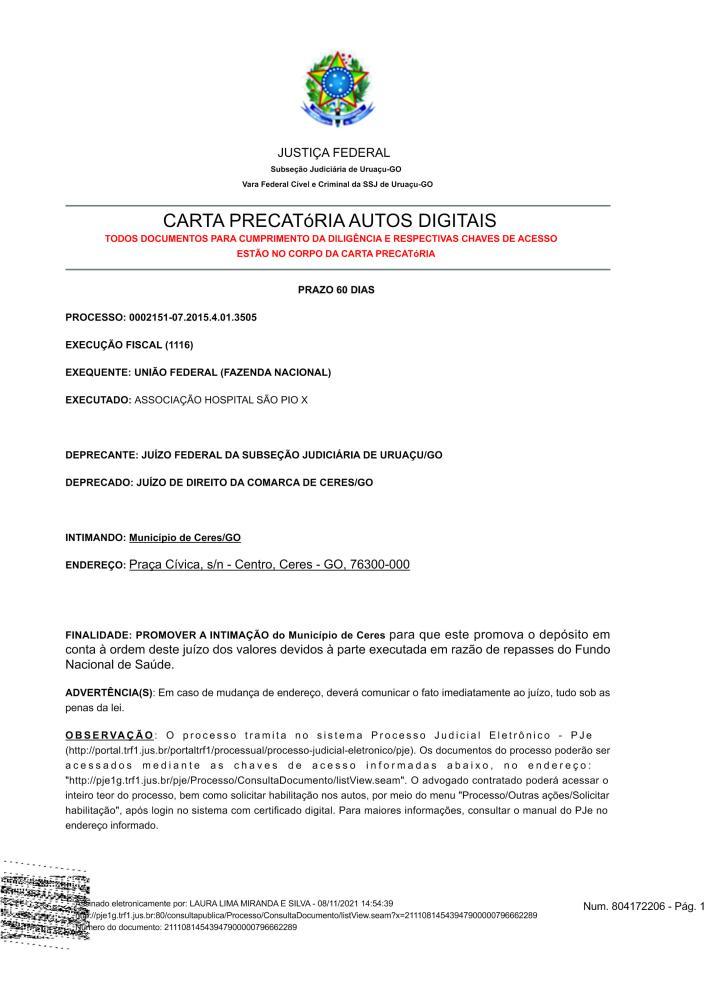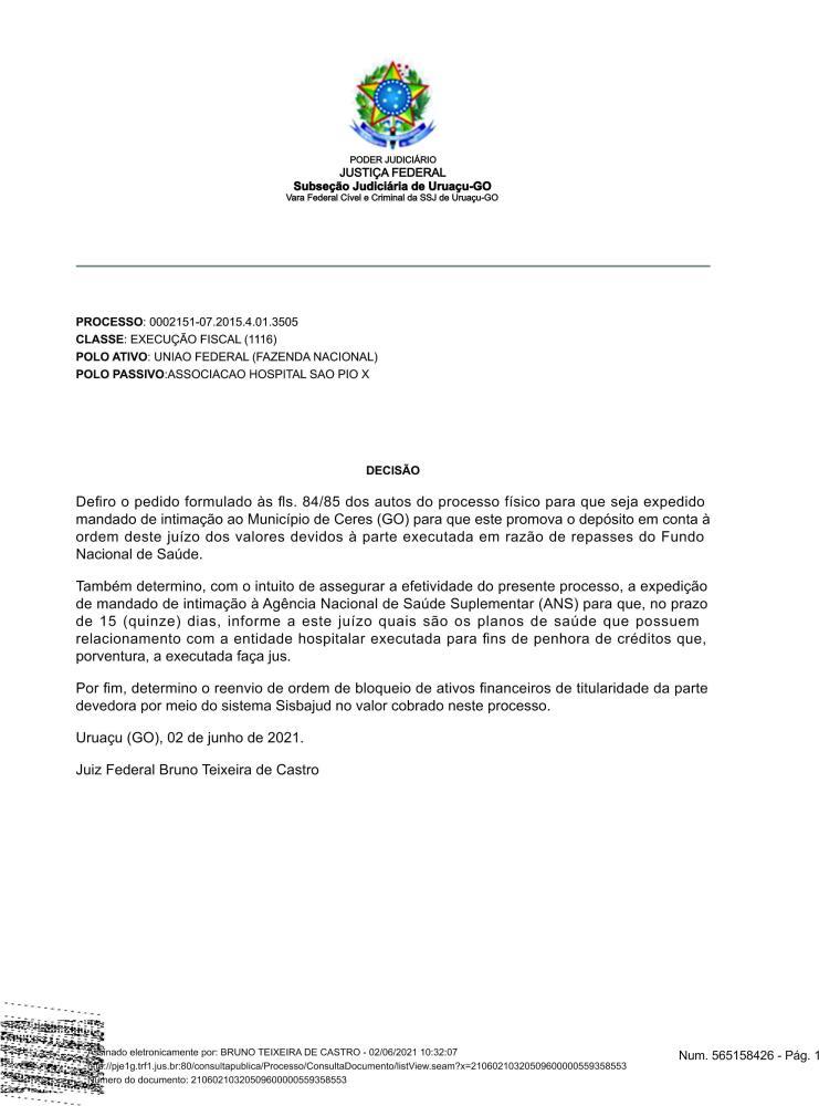 Por DETERMINAÇÃO da Justiça Federal de Uruaçu em uma Ação de Execução movida pela União em face do Hospital Pio X, processo nº 0002151-07.2015.4.01.3505, o Município de Ceres foi impedido de realizar o valor integral de valores para a Associação.