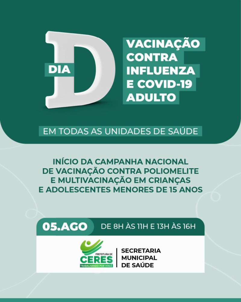 A Prefeitura de Ceres, por meio da Secretaria Municipal de Saúde, informa que, nesta sexta-feira (5 de agosto) é o Dia "D" de vacinação contra Influenza e Covid-19 para adultos. A vacinação ocorrerá em todas as Unidades Básicas de Saúde (UBS) do município (veja abaixo), no horário de 8h às 11h e de 13h às 16h.