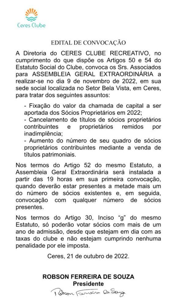 Tweet Informativo Ceres Clube Comunicado FOTOS NOTÍCIAS RELACIONADAS Atenção, empreendedor! Prefeitura de Ceres informa: Atenção, empreendedor! O Alvará de Funcionamento 2026 já... Câmara de Ceres informa! 8 de Março, Dia Internacional da Mulher Aqui a sua voz é ouvida! CONCHESP INFORMA: Aqui a sua voz é ouvida!O Conchesp atua como um verdadeiro aliado do consumidor de... Mais lidas ComunicadoComunicadoCidadaniaJustiçaEsporte Comunicado Ceres - Goiás informa: 24 Edital de Convocação Comunicado 6º EDITAL DE CONVOCAÇÃO – PROCESSO SELETIVO... Comunicado Edital de abertura do processo eleitoral,... Aluguel Social com Vagas em Ceres Lei federal de sustentabilidade financeira dos... Palestra sobre Gestão Ambiental da obra de...