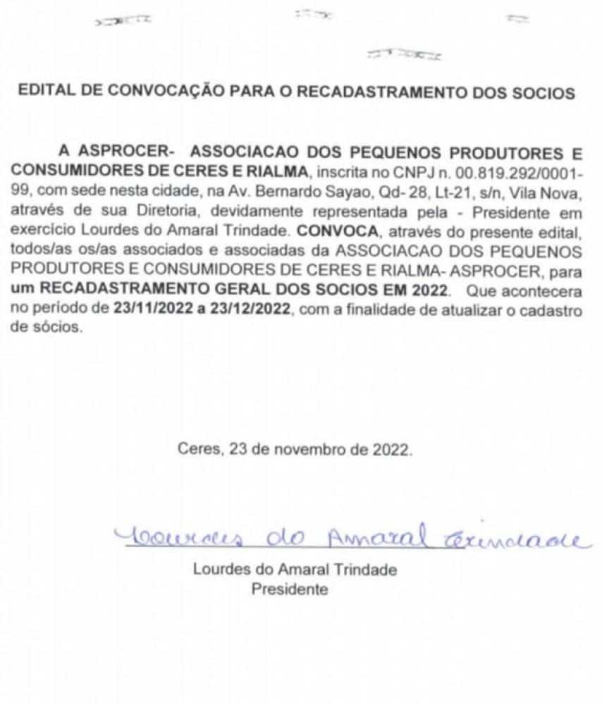 Tweet CERES - EDITAL DE CONVOCAÇÃO PARA RECADASTRAMENTO DOS SÓCIOS DA ASPROCER Comunicado NOTÍCIAS RELACIONADAS Atenção, empreendedor! Prefeitura de Ceres informa: Atenção, empreendedor! O Alvará de Funcionamento 2026 já... Câmara de Ceres informa! 8 de Março, Dia Internacional da Mulher Aqui a sua voz é ouvida! CONCHESP INFORMA: Aqui a sua voz é ouvida!O Conchesp atua como um verdadeiro aliado do consumidor de... Mais lidas ComunicadoComunicadoCidadaniaJustiçaEsporte Comunicado Ceres - Goiás informa: 24 Edital de Convocação Comunicado 6º EDITAL DE CONVOCAÇÃO – PROCESSO SELETIVO... Comunicado Edital de abertura do processo eleitoral,... Aluguel Social com Vagas em Ceres Lei federal de sustentabilidade financeira dos... Palestra sobre Gestão Ambiental da obra de...