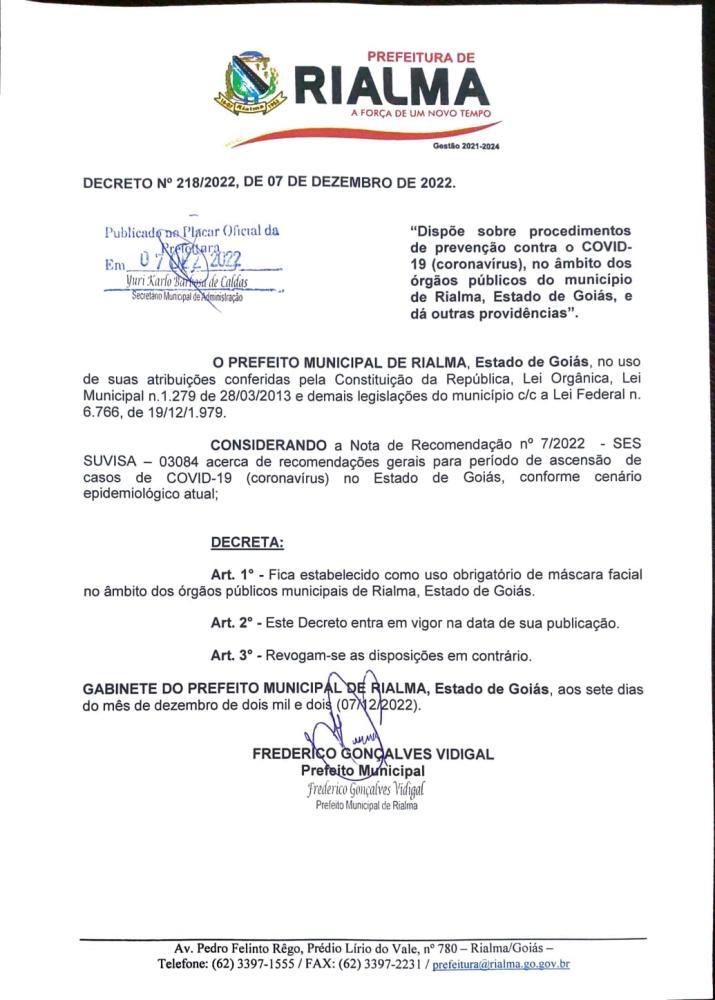 ComunicadoA Prefeitura Municipal de Rialma por meio do Prefeito Fred Vidigal, emite Decreto nº 218/2022 nesta quarta-feira (07/12/2022), que dispõe sobre procedimento de prevenção contra o Covid - 19 ( Coronavírus), no âmbito dos orgãos públicos do município de Rialma.