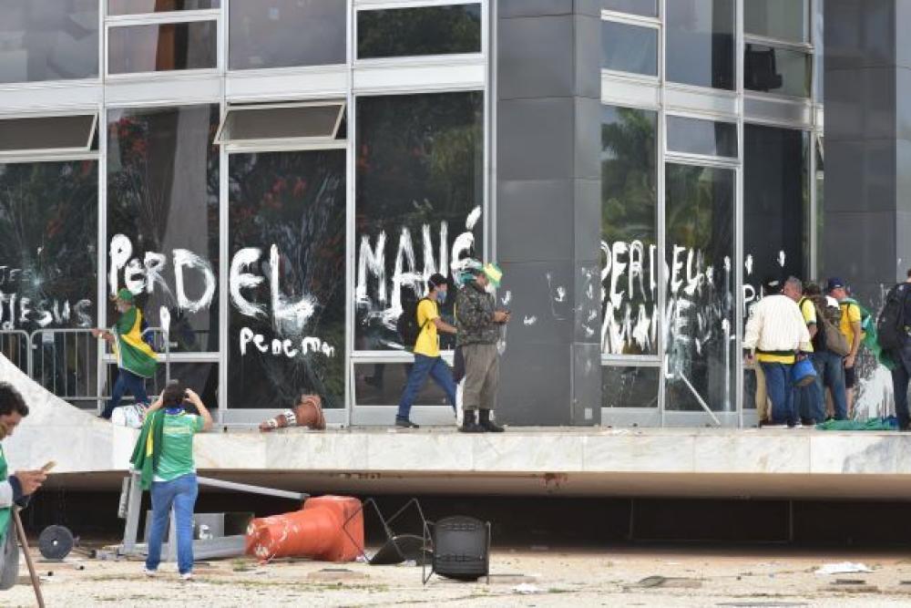 Diversos objetos foram arremessados por bolsonaristas terroristas para fora do Palácio do Planalto, a destruição foi total. Danificaram e destruíram a Galeria de fotos dos presidentes da República, o Palácio do Planalto, a Sala da primeira-dama, Janja; o Prédio do Supremo Tribunal ficaram com todos os vidros quebrados; O plenário do Supremo Tribunal com todos os bancos quebrados e jogados do local, tapetes molhados e danificados, cadeiras arrancadas e destruídas. Não pouparam nada, até as Obras de artes e móveis no Palácio Presidencial também todos destruídos. Nada em condições de serem aproveitados. Um estrago incalculável em todos os espaços invadidos.