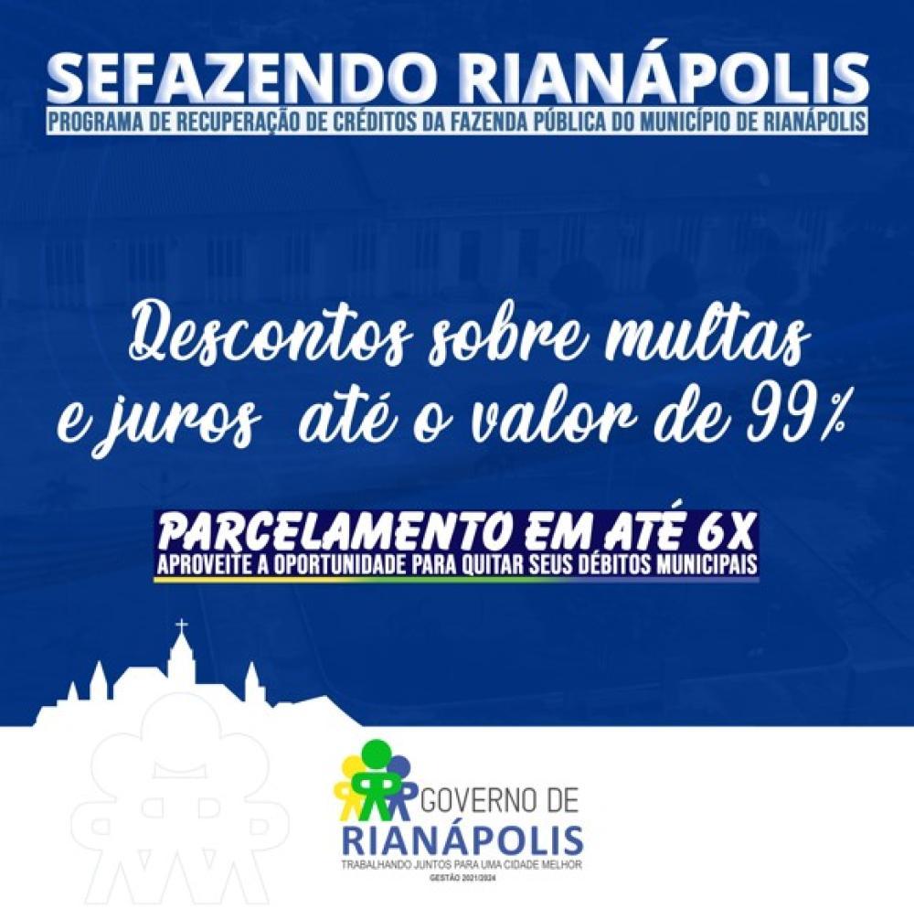 Está aberto o novo Programa de Recuperação de Crédito de Rianápolis, o SEFAZENDO. Esse programa, conta com descontos de até 99% sobre multas e juros, e também com parcelamento. O intuito é ajudar cidadãos de nossa cidade a regularizar impostos e pendências em atraso com o município. Aproveite essa oportunidade e regularize seus débitos municipais!