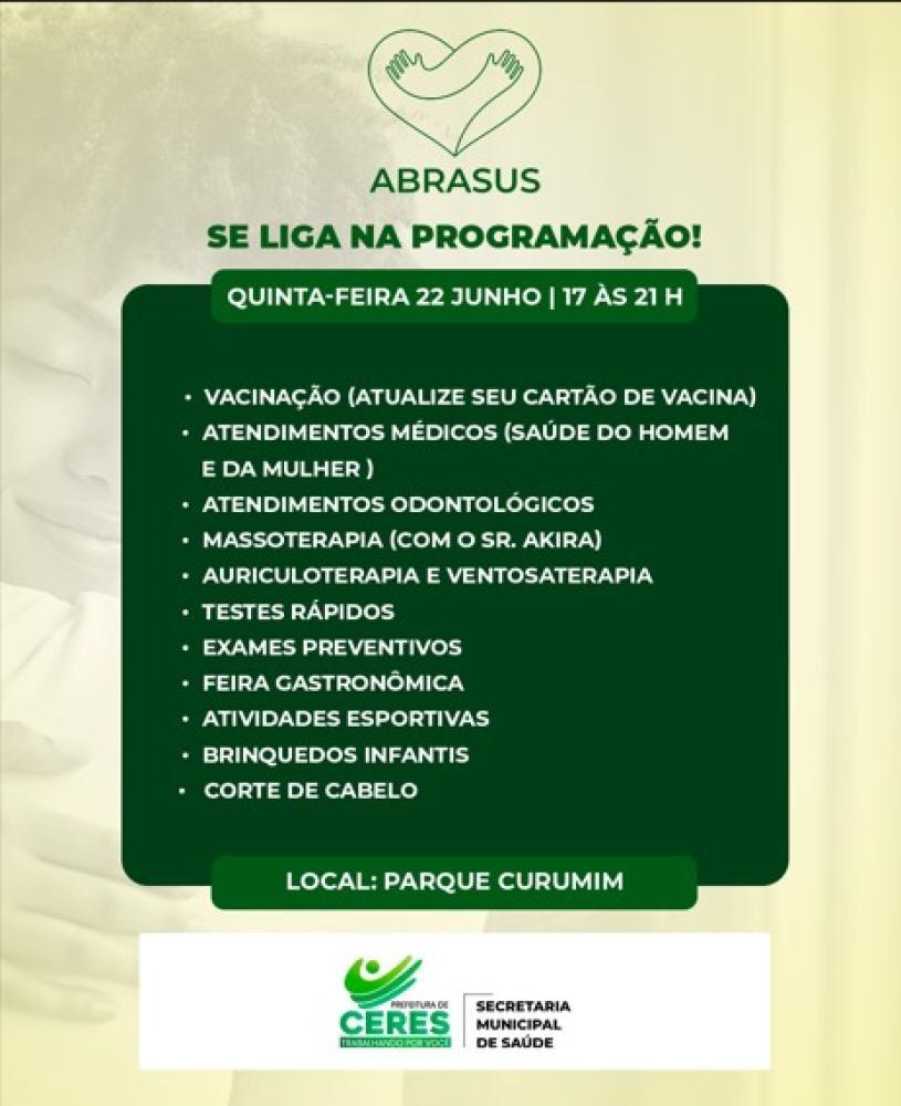 Nesta quinta-feira (22), á partir das 17 horas no Parque Curumim, a Prefeitura Municipal de Ceres por meio da Secretaria Municipal de Saúde traz uma programação especial para você com Atendimentos médicos da saúde do homem e da mulher; atendimentos odontológicos; massoterapia; auriculoterapia e ventosaterapia; testes rápidos; exames preventivos; cortes de cabelo; feira gastronômica; recreação e brinquedos infantis.