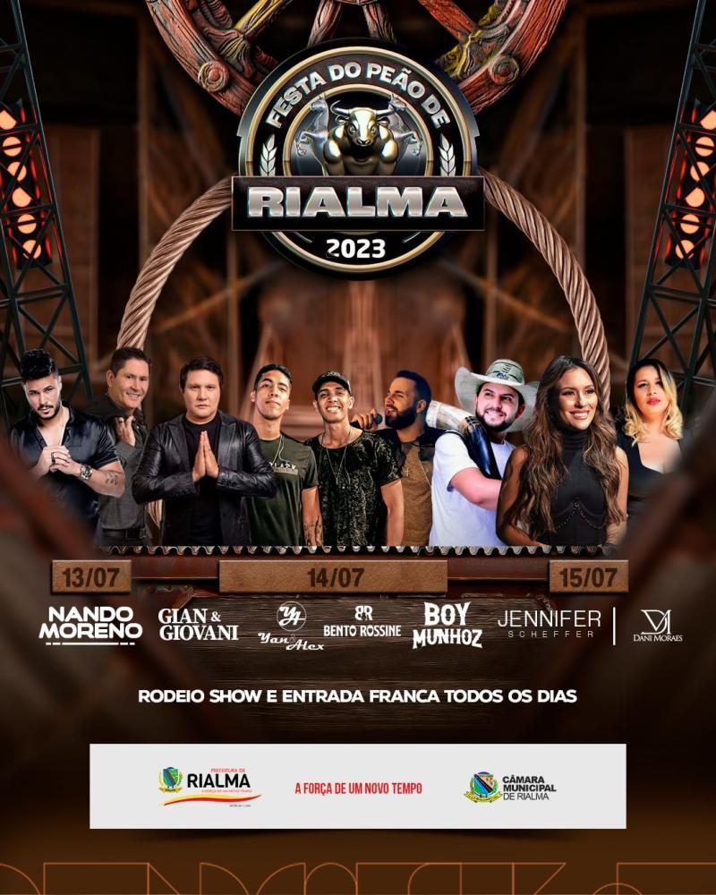 De manhã à partir das 10hs Inauguração das obras, início frente ao Hospital Municipal de Rialma. À noite, Rodeio Profissional, com as melhores competições e shows musicais com: Yan e Alex, Boy Munhoz, Bento Rossine e a dupla mais apaixonada do Brasil, Gian e Giovane.