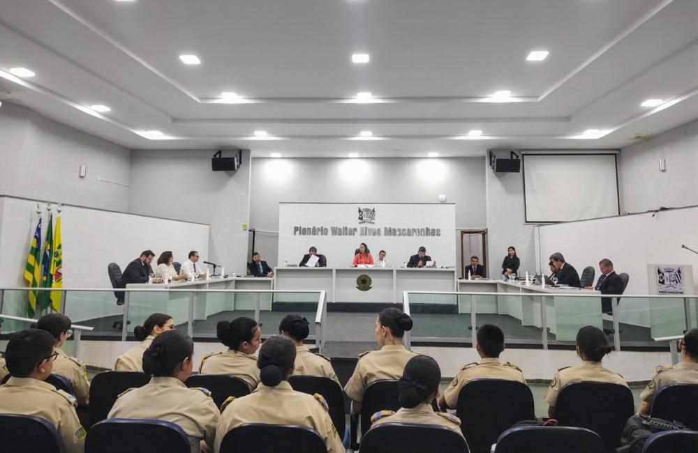 Os alunos do oitavo ano do Colégio da Polícia Militar do Estado de Goiás - Hélio Veloso, de Ceres-GO, vieram visitar o plenário da Câmara para acompanhar e aprender como é a rotina de uma Sessão e fizeram uma breve apresentação.