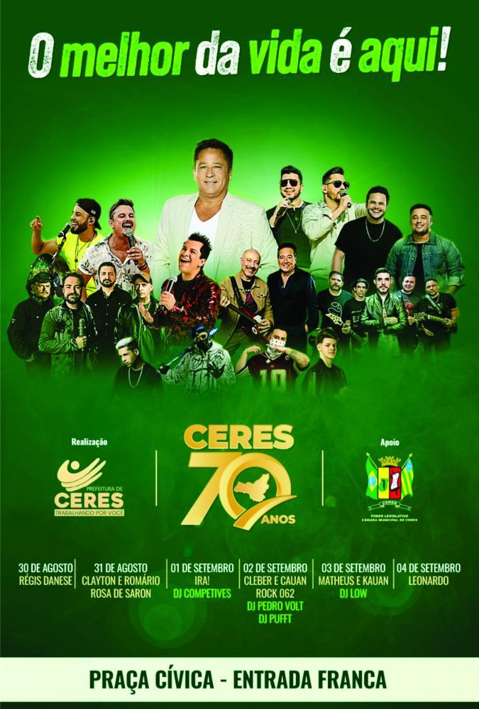 No próximo dia 4 de setembro, a cidade de Ceres completa 70 anos de emancipação política e, para comemorar, a Prefeitura Municipal preparou uma programação que promete agradar todos os públicos. Serão realizados shows, exposições, apresentações culturais e inaugurações de obras durante seis dias. O evento será realizado na Praça Cívica, aberto ao público, com início na quarta-feira, 30 de agosto.