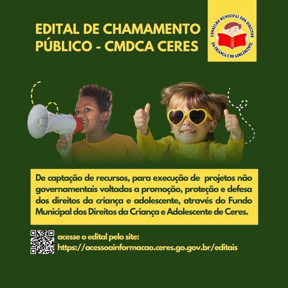 ComunicadoO Conselho Municipal dos Direitos da Criança e do Adolescente torna público o presente Edital de Chamamento Público para Chancela de Projetos Não Governamentais para captação de recursos, que tenham por objeto a execução de programas e ações com projetos voltados a promoção, proteção e defesa de direitos da criança e adolescente, através do Fundo Municipal de Direitos da Criança e Adolescente de Ceres Goiás.
