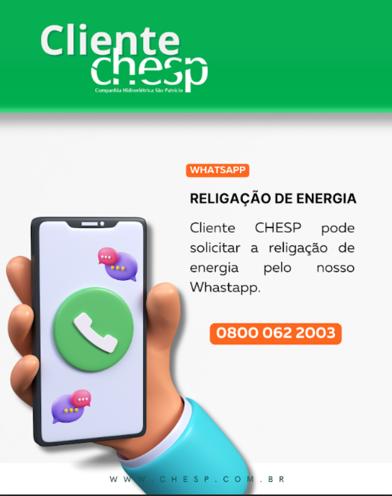 Solicite a religação de sua energia de modo rápido e fácil por meio do nosso Whastapp, 0800 062 2003.