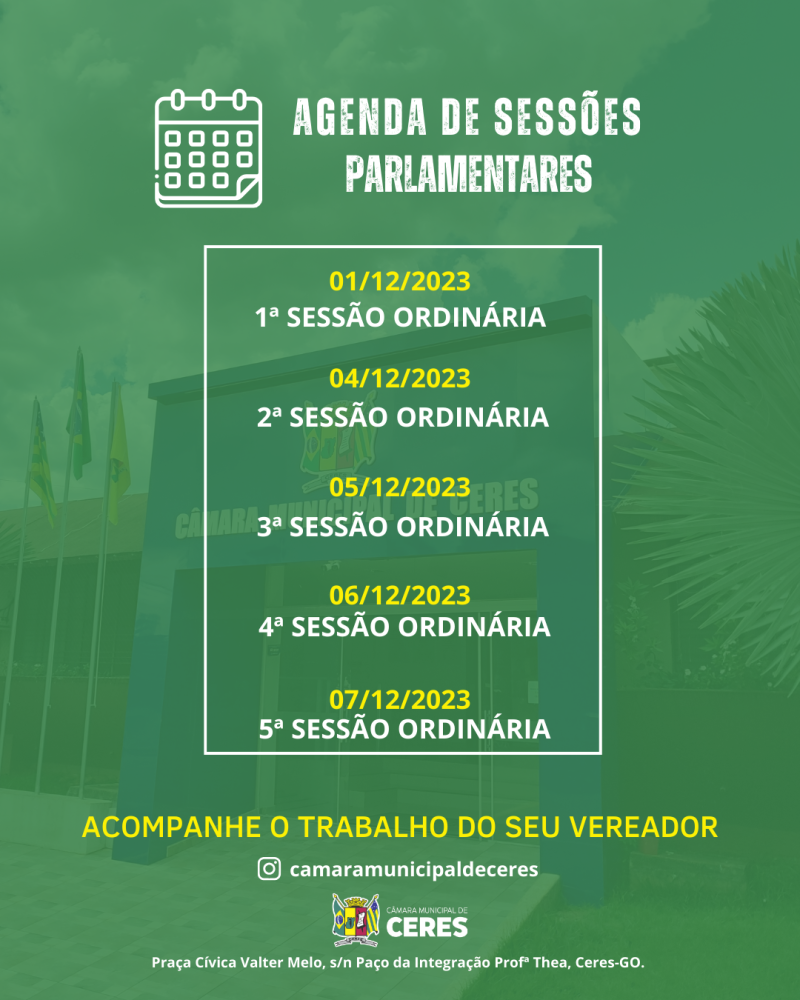 Tweet Reuniões da Câmara Municipal de Ceres Comunicado NOTÍCIAS RELACIONADAS Palestra especial com Dra. Luciana Darrot, trazendo conhecimento e motivação para mulheres que desejam empreender, crescer e transformar suas realidades. Prefeitura de Rialma informa: Evento Mulher EmpreendedoraUm momento especial de inspiração,... Convite para a 1ª Feira do Agronegócio do Vale do São Patrício Convite para a 1ª Feira do Agronegócio do Vale do São Patrício O secretário de... Câmara Municipal de Ceres realiza a 1ª Sessão Ordinária do mês de março de 2026 Câmara Municipal de Ceres realiza a 1ª Sessão Ordinária do mês de março de... Ceres promove capacitação sobre cuidados com o pé diabético e recebe R$ 10 mil para fortalecer Atenção Básica Ceres promove capacitação sobre cuidados com o pé diabético e recebe R$ 10 mil para... Mais lidas ComunicadoComunicadoCidadaniaJustiçaMeio Ambiente Comunicado Rianápolis celebra o encerramento da 9ª Copa... Comunicado Ceres - Goiás informa: 24 Edital de Convocação Comunicado 6º EDITAL DE CONVOCAÇÃO – PROCESSO SELETIVO... ConCHESP realiza a primeira reunião de 2026 e... Visita institucional fortalece a saúde de Ceres Aluguel Social com Vagas em Ceres