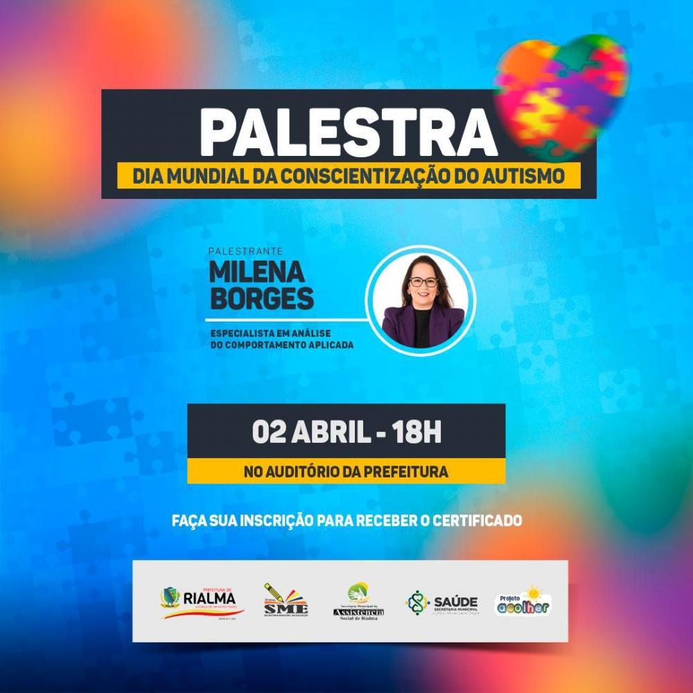 ComunicadoA Prefeitura de Rialma, por meio da Secretaria Assistência Social, Secretaria de Educação e Secretaria de Saúde convida toda a população para participar de uma palestra sobre o diagnóstico, tratamento e prognóstico do autismo, com a Dra. Milena Borges, Especialista em Análise Aplicada do Comportamento. Será no dia 2 de abril, no auditório da prefeitura às 18h.