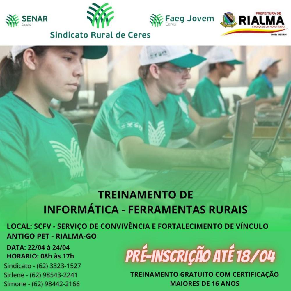 ComunicadoA prefeitura de Rialma, promove em parceria com o Sistema FAEG/SENAR, o treinamento de informática (ferramentas rurais).