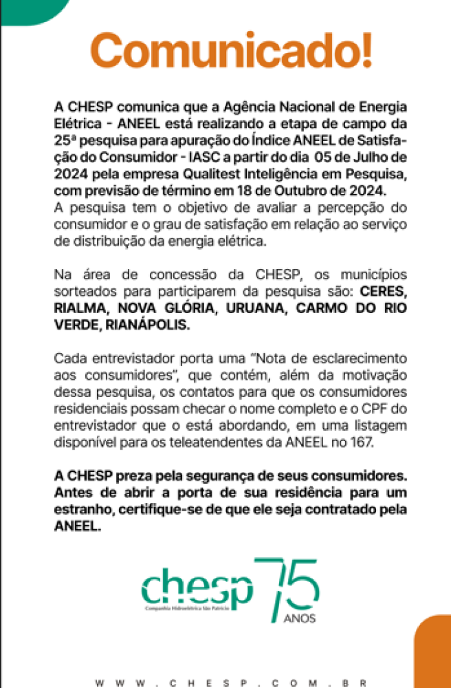 #comunicado #aneel #chesp #conchesp #pesquisa #distribuicaodeenergia #ceres #rialma #uruana #carmodorioverde #saopatricio #ipirangadegoias #santaisabel #rianapolis #jaragua