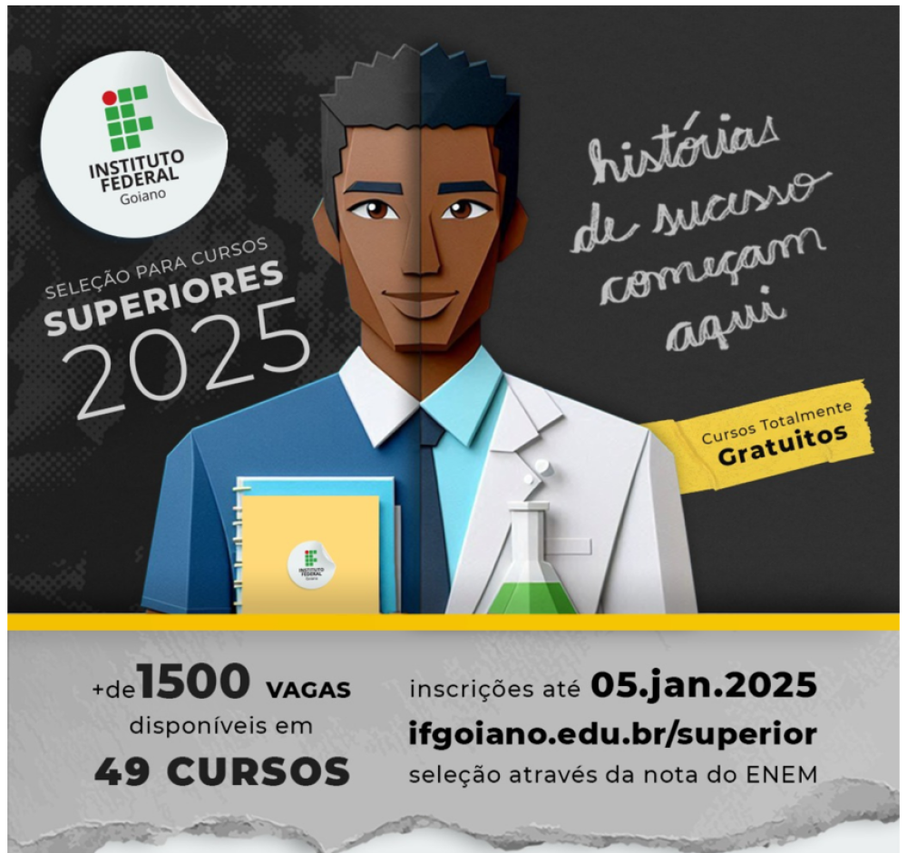 Graduações tem inscrição até 5 de janeiro — Os interessados em cursar uma graduação no Campus Ceres têm um pouco mais de tempo para se inscrever, já que o prazo se encerra somente em janeiro. O passo a passo é igual ao do Ensino Médio Técnico, e o endereço é www.ifgoiano.edu.br/superior.