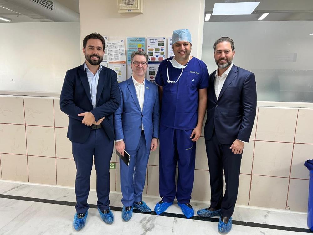 Marcando um dos últimos compromissos oficiais da missão internacional à Índia, o prefeito de Rio Verde, Wellington Carrijo, e o deputado estadual Lucas do Vale (MDB) visitaram com exclusividade o hospital Narayana Health, referência mundial em atendimento de alta complexidade e baixo custo. A visita, liderada pelo governador Ronaldo Caiado (UB), teve como destaque a assinatura de um termo de cooperação entre o Governo de Goiás e a unidade hospitalar indiana para a implementação de tecnologias inovadoras, que incluem telemedicina e integração de prontuários.
