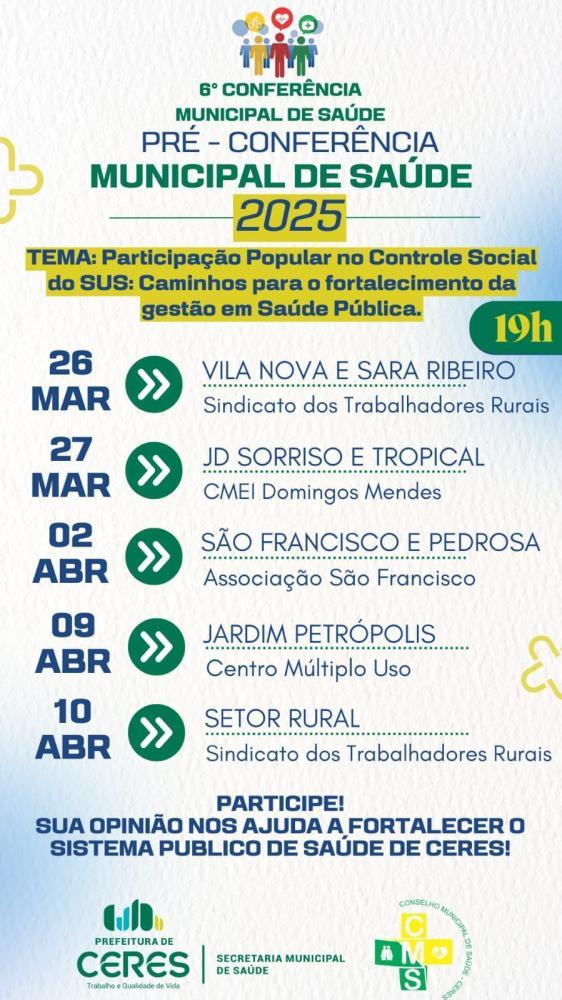 Tweet Ceres - Go - Pré Conferência na Saúde Comunicado NOTÍCIAS RELACIONADAS 8 de Março, Dia Internacional da Mulher Aqui a sua voz é ouvida! CONCHESP INFORMA: Aqui a sua voz é ouvida!O Conchesp atua como um verdadeiro aliado do consumidor de... Mais de 25 toneladas de pneus inservíveis tiveram a destinação correta! Prefeitura de Rianápolis informa: Mais de 25 toneladas de pneus inservíveis tiveram a... Cronograma da Coleta de Limpeza Urbana Prefeitura de Rialma informa: Cronograma da Coleta de Limpeza UrbanaA Prefeitura de Rialma informa que a coleta de... Mais lidas ComunicadoComunicadoCidadaniaJustiçaMeio Ambiente Comunicado Rianápolis celebra o encerramento da 9ª Copa... Comunicado Ceres - Goiás informa: 24 Edital de Convocação Comunicado 6º EDITAL DE CONVOCAÇÃO – PROCESSO SELETIVO... ConCHESP realiza a primeira reunião de 2026 e... Visita institucional fortalece a saúde de Ceres Aluguel Social com Vagas em Ceres