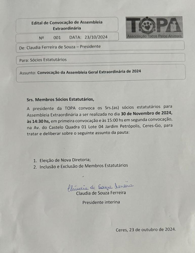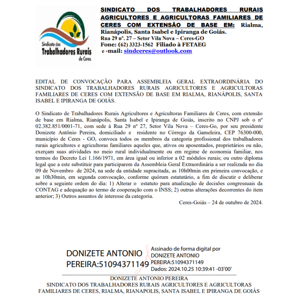 Convoca todos interessados para uma reunião a ser realizada no dia 25 de Abril de 2025 às 19:45hs no Espaço Ambiental na Praça do La Viola – Centro em Itapaci – Goiás.