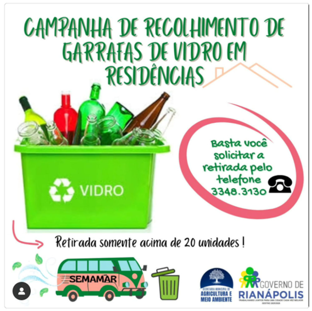 A Prefeitura de Rianápolis informa: Agora você pode acionar a equipe da Secretaria de Meio Ambiente para fazer as coletas de garrafas e potes de vidro.