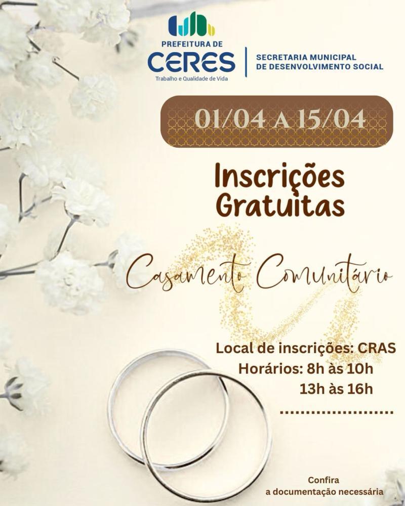 Tweet Ceres - Casamento Comunitário - Veja como participar Cidadania FOTOS NOTÍCIAS RELACIONADAS Vem ai a Corrida do Café ! Carnaval no encontro com os Idosos do Projeto Conviver Encontro com os Idosos do Projeto Conviver Hoje, a Secretaria Municipal de Desenvolvimento Social recebeu com muita... Ceres tem políticas públicas voltadas as crianças O Serviço de Convivência e Fortalecimento de Vínculos (SCFV) teve início nesta semana em... Prefeitura de Ceres busca a valorização dos servidores e, transforma em reconhecimento. Valorização que se transforma em reconhecimento.Prefeito Edmário de Castro encaminha à... Mais lidas ComunicadoComunicadoCidadaniaJustiçaEsporte Comunicado VOCÊ TEM UMA IDEIA… MAS ELA AINDA NÃO VIROU... Cidadania Semi Final da 9ª Copa Regional de Futsal de... Comunicado Rianápolis celebra o encerramento da 9ª Copa... 6º EDITAL DE CONVOCAÇÃO – PROCESSO SELETIVO... ConCHESP realiza a primeira reunião de 2026 e... 1ª SESSÃO ORDINÁRIA DA CÂMARA MUNICIPAL DE...