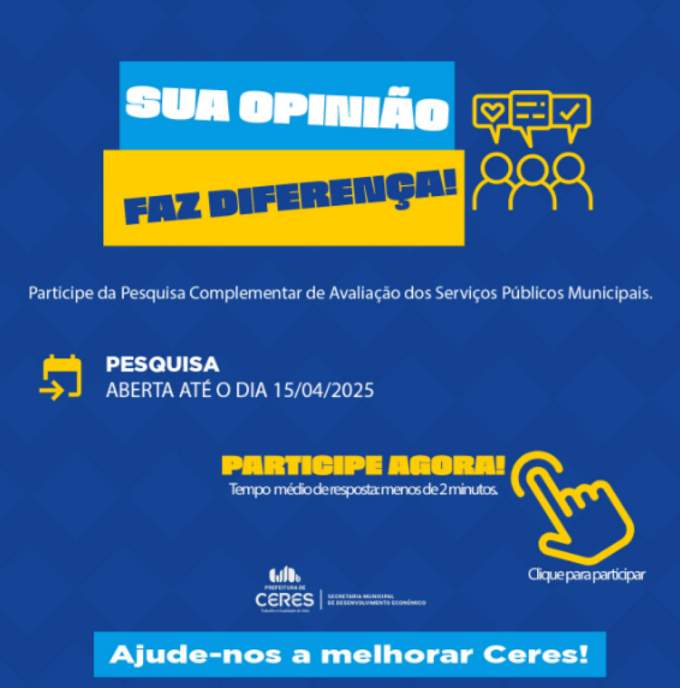 A Prefeitura Municipal de Ceres está realizando a "Escuta Cidadão" para saber o que a população pensa sobre a cidade e o que pode melhorar. Leva menos de 2 minutos pra responder!