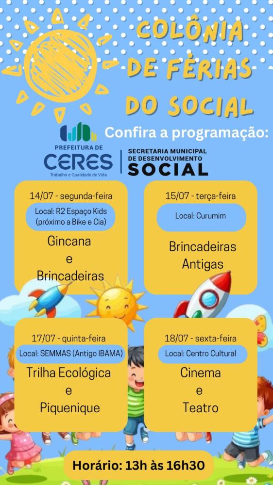Durante o mês de julho, a Prefeitura de Ceres, por meio da Secretaria Municipal de Desenvolvimento Social, estará promovendo a Colônia de Férias, uma ação pensada com carinho para garantir momentos de diversão, aprendizado e segurança para nossas crianças no período de recesso escolar.