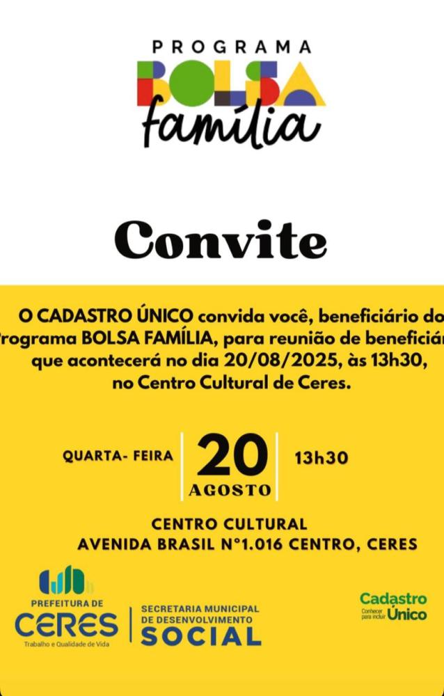 Tweet Ceres - Assistência Social - Programa Bolsa Família Comunicado NOTÍCIAS RELACIONADAS Aqui a sua voz é ouvida! CONCHESP INFORMA: Aqui a sua voz é ouvida!O Conchesp atua como um verdadeiro aliado do consumidor de... Mais de 25 toneladas de pneus inservíveis tiveram a destinação correta! Prefeitura de Rianápolis informa: Mais de 25 toneladas de pneus inservíveis tiveram a... Cronograma da Coleta de Limpeza Urbana Prefeitura de Rialma informa: Cronograma da Coleta de Limpeza UrbanaA Prefeitura de Rialma informa que a coleta de... Bandeira verde em março CHESP informa: Bandeira verde em março A ANEEL anunciou que a bandeira tarifária para este... Mais lidas ComunicadoComunicadoCidadaniaJustiçaEsporte Comunicado VOCÊ TEM UMA IDEIA… MAS ELA AINDA NÃO VIROU... Cidadania Semi Final da 9ª Copa Regional de Futsal de... Comunicado Rianápolis celebra o encerramento da 9ª Copa... 6º EDITAL DE CONVOCAÇÃO – PROCESSO SELETIVO... ConCHESP realiza a primeira reunião de 2026 e... Ceres - Goiás informa: 24 Edital de Convocação