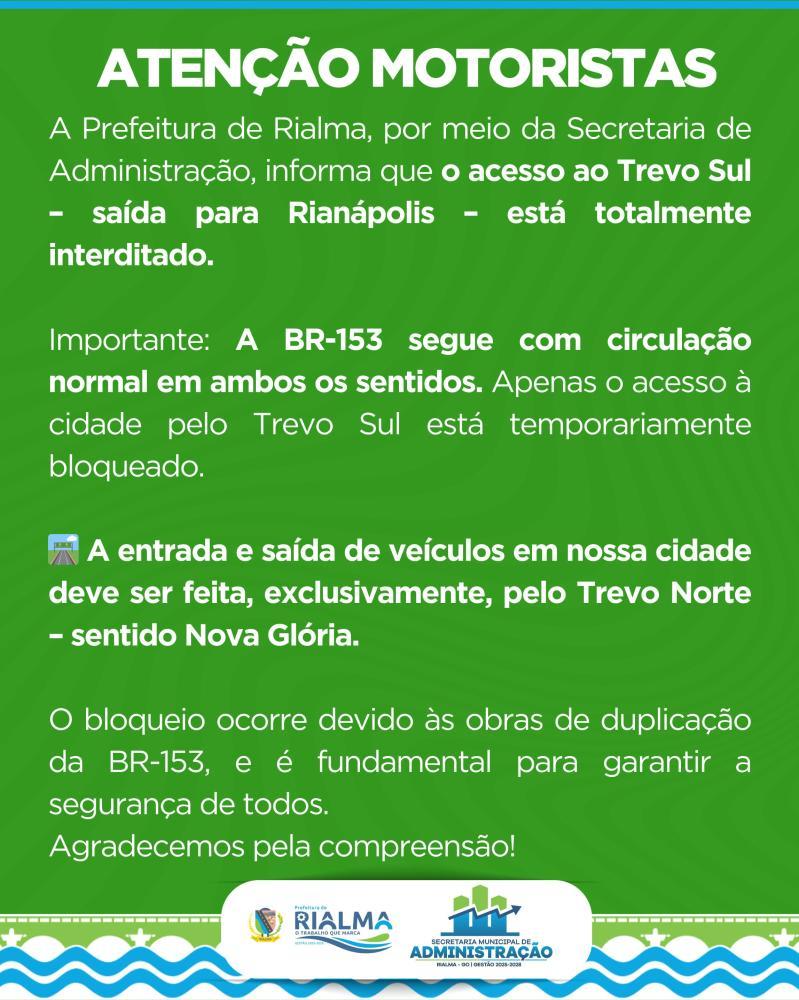 A Prefeitura de Rialma, por meio da Secretaria de Administração, informa que o acesso ao Trevo Sul (sentido Rianápolis) está totalmente interditado.