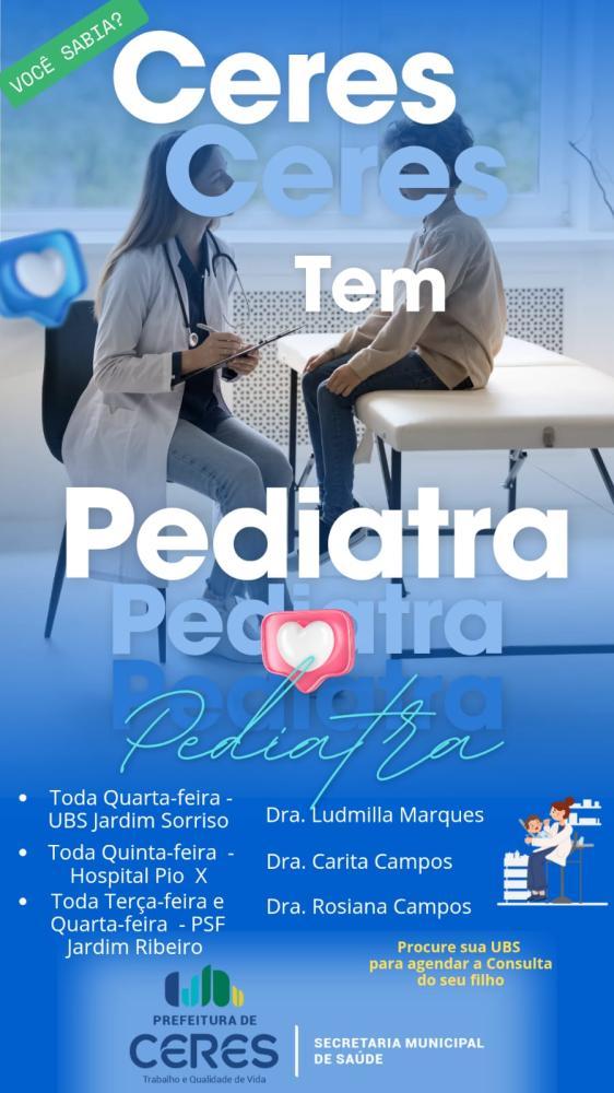 Tweet Ceres tem Pediatria Comunicado NOTÍCIAS RELACIONADAS Palestra especial com Dra. Luciana Darrot, trazendo conhecimento e motivação para mulheres que desejam empreender, crescer e transformar suas realidades. Prefeitura de Rialma informa: Evento Mulher EmpreendedoraUm momento especial de inspiração,... Convite para a 1ª Feira do Agronegócio do Vale do São Patrício Convite para a 1ª Feira do Agronegócio do Vale do São Patrício O secretário de... Câmara Municipal de Ceres realiza a 1ª Sessão Ordinária do mês de março de 2026 Câmara Municipal de Ceres realiza a 1ª Sessão Ordinária do mês de março de... Ceres promove capacitação sobre cuidados com o pé diabético e recebe R$ 10 mil para fortalecer Atenção Básica Ceres promove capacitação sobre cuidados com o pé diabético e recebe R$ 10 mil para... Mais lidas ComunicadoComunicadoCidadaniaJustiçaEsporte Comunicado VOCÊ TEM UMA IDEIA… MAS ELA AINDA NÃO VIROU... Cidadania Semi Final da 9ª Copa Regional de Futsal de... Comunicado Rianápolis celebra o encerramento da 9ª Copa... 6º EDITAL DE CONVOCAÇÃO – PROCESSO SELETIVO... ConCHESP realiza a primeira reunião de 2026 e... 1ª SESSÃO ORDINÁRIA DA CÂMARA MUNICIPAL DE...
