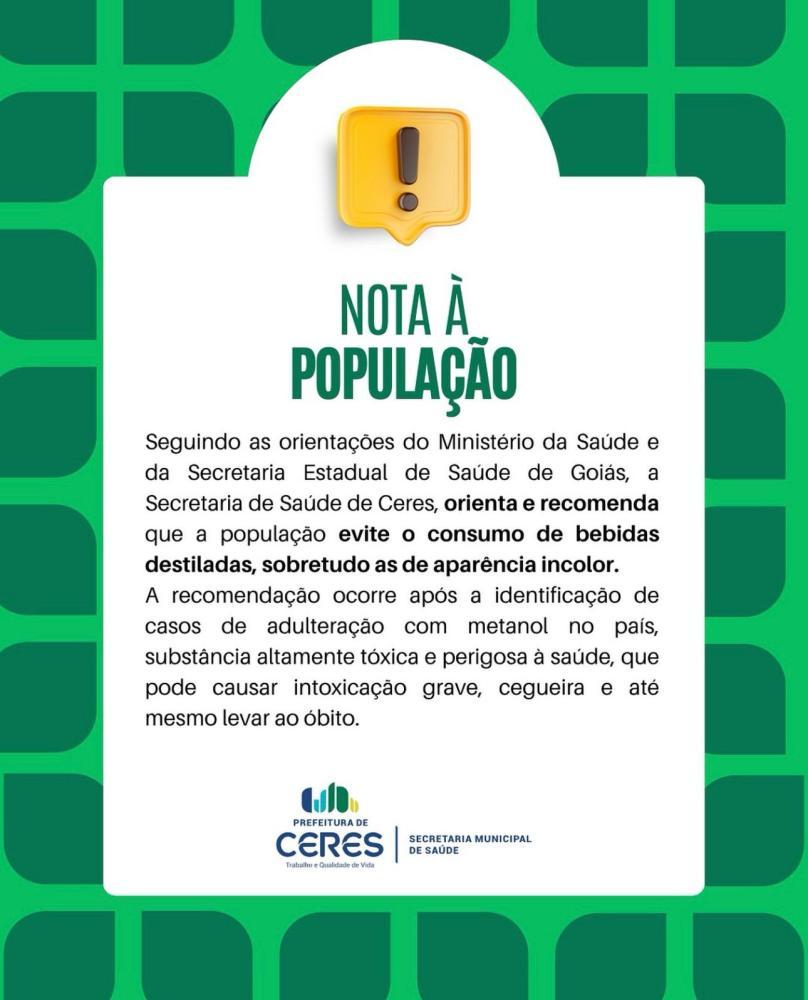 ATENÇÃO! Comunicado importante e seguindo orientações do Ministério da Saude e da Secretaria Estadual da Saude de Golás, recomendamos à população que não consuma bebidas alcoólicas neste momento.