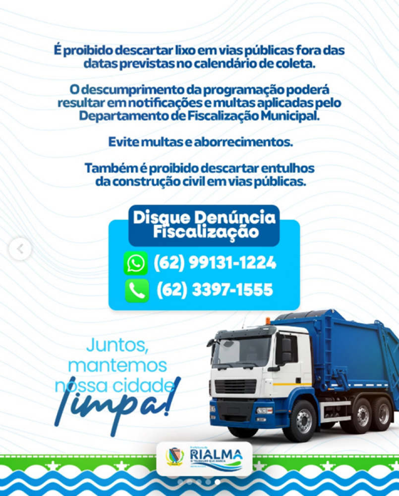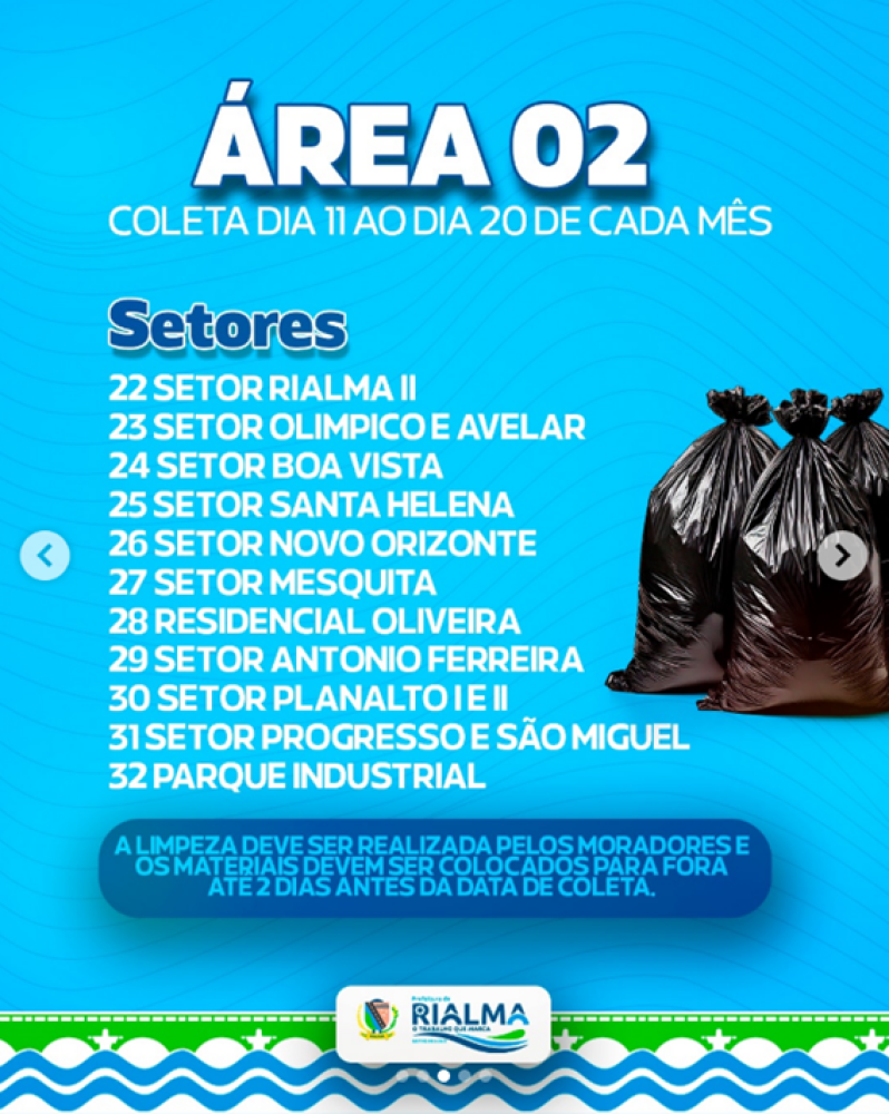 A Prefeitura de Rialma informa que a coleta de podas de galhadas, corte de mato, gramas e materiais que possam acumular água seguirá um cronograma organizado por setores em toda a cidade.
