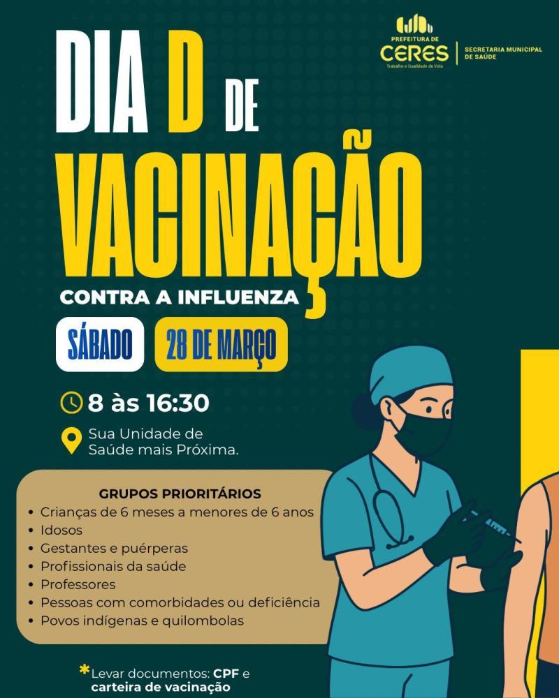 ComunicadoNeste sábado, dia 28 de março, todas as Unidades de Saúde estarão abertas das 8h às 16h30 para vacinação.