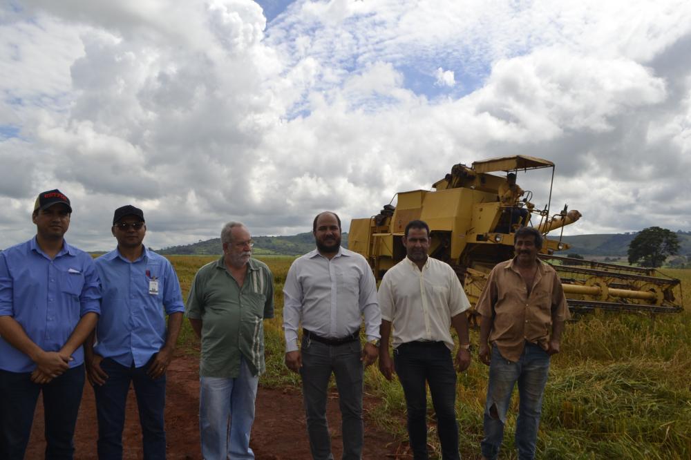 Acompanhando a colheita o Engenheiro Agrônomo Cleiton Cândido Correia Tavares e o Coordenador de Tratos Culturais Adelson Pereira da Silva da empresa Cooper-Rubi. Lembra que a empresa tem buscado ser parceira com o município e nesta ação, cedeu a área para o plantio de arroz da lavoura comunitária.