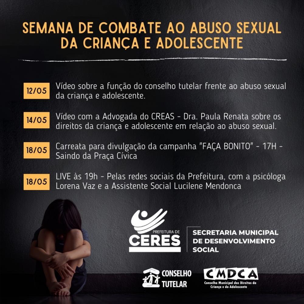 A campanha - denominada de Semana de Combate ao Abuso Sexual de Crianças e Adolescentes, será iniciada com um vídeo publicado nas redes sociais da Prefeitura de Ceres, no dia 12/05, relatando a importância e o papel do Conselho Tutelar na luta contra este tipo de violência.